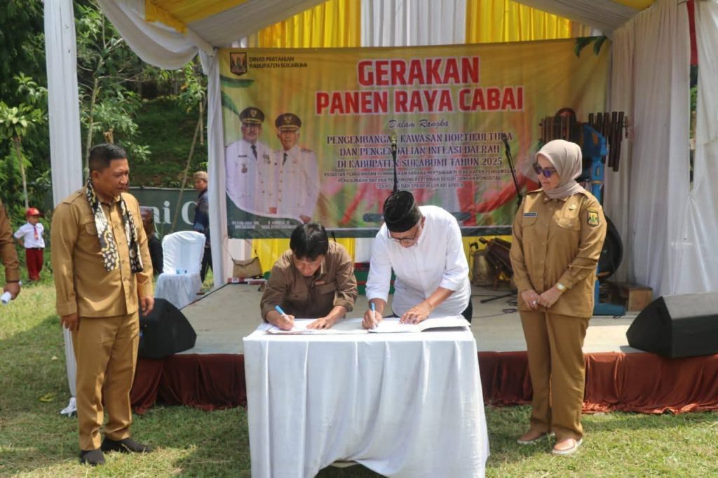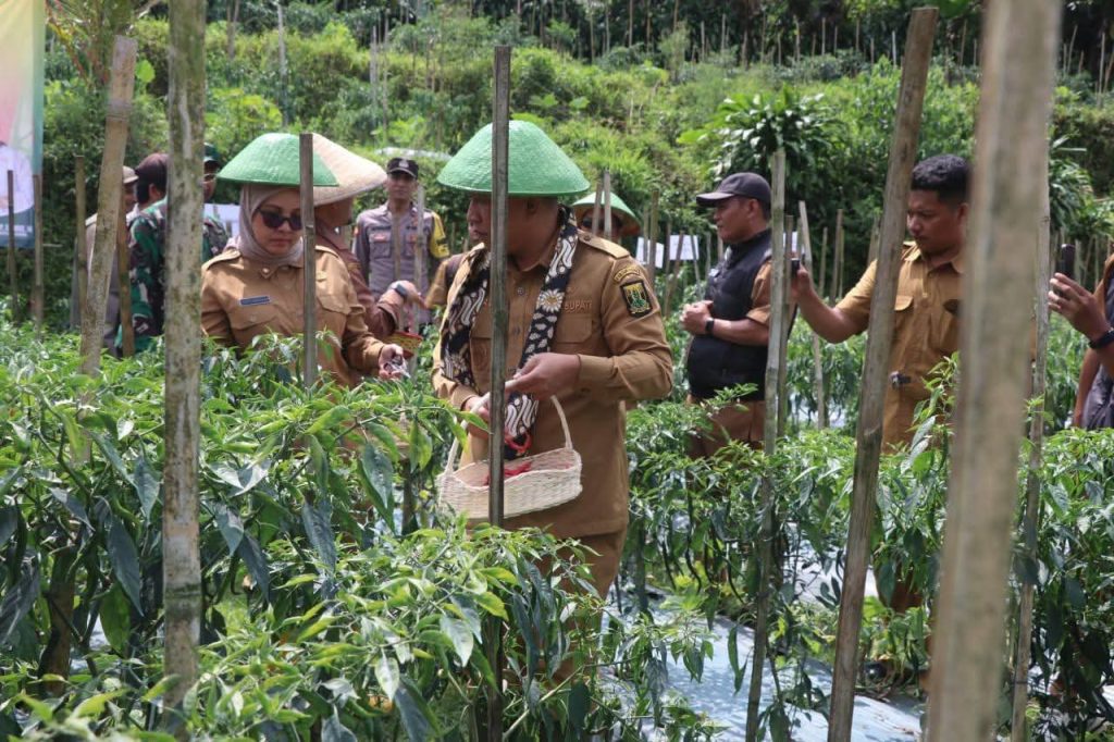 Wakil Bupati Sukabumi H. Andreas memetik cabai bersama para petani di Desa Cipeuteuy, Kecamatan Kabandungan, Senin, 28 Juli 2025. Hal itu dilakukan dalam rangka gerakan panen raya cabai di Kabupaten Sukabumi.