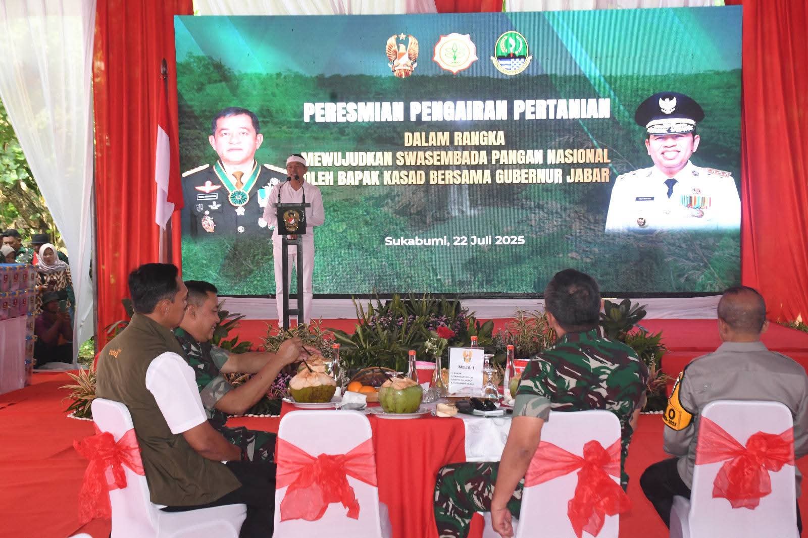 Bupati Sukabumi H Asep Japar mendampingi Kepala Staf Angkatan Darat (KSAD) Jenderal TNI Maruli Simanjuntak dan Gubernur Jawa Barat Dedi Mulyadi meresmikan sistem pengairan pertanian di Desa Pangumbahan, Kecamatan Ciracap, Kabupaten Sukabumi, Selasa (22/7/2025).