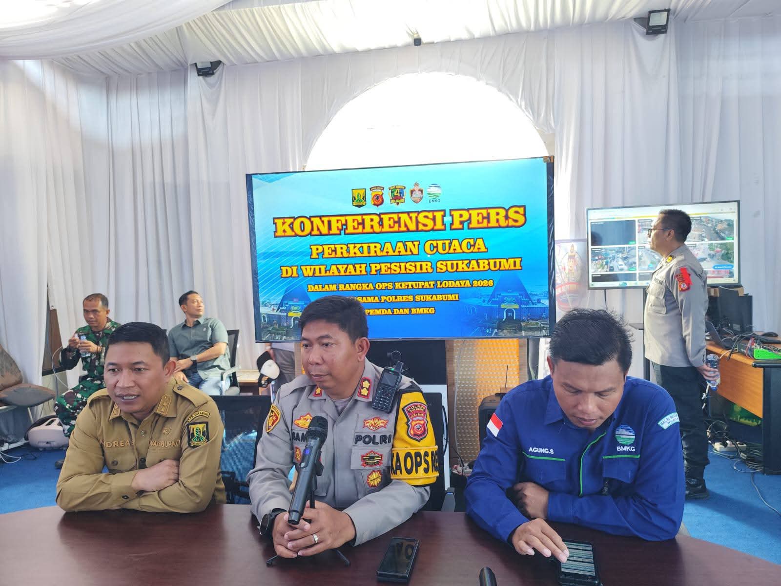 Kepala Stasiun Geofisika Kelas III BMKG Sukabumi, Agung Saptaji, turut memaparkan kondisi cuaca terkini di wilayah Sukabumi. Meski curah hujan relatif lebih rendah dibandingkan wilayah utara seperti Bogor, ia menegaskan bahwa gelombang laut Palabuhanratu perlu menjadi perhatian serius.