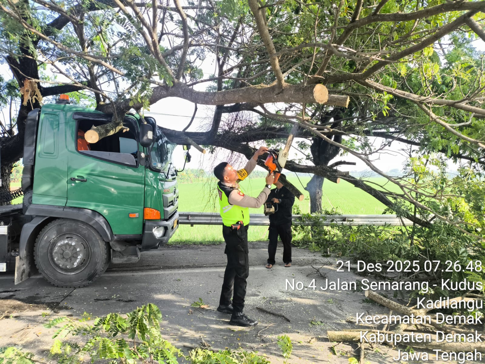 DEMAK NEWS FAKTA HUKUM DAN HAM CO lD—- Kepolisian Resor (Polres) Demak, Jawa Tengah, bersama Badan Penanggulangan Bencana Daerah (BPBD) Kabupaten Demak melakukan evakuasi pohon tumbang di exit Tol Kadilangu, Minggu (21/12/2025) pagi. Peristiwa tersebut terjadi sekitar pukul 07.00 WIB dan langsung mendapat penanganan cepat dari petugas gabungan.