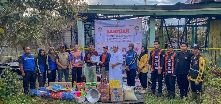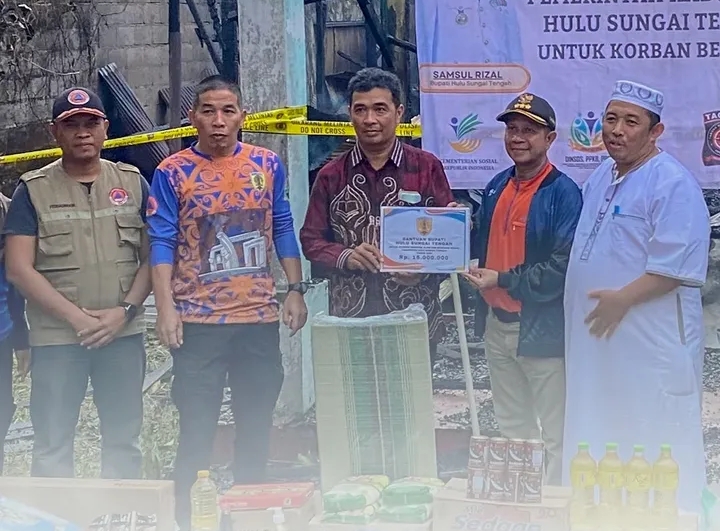 Pemerintah Kabupaten Hulu Sungai Tengah (HST) melalui Dinas Sosial, PPKB, PPPA bersama BPBD HST, Camat, aparat desa, serta Taruna Siaga Bencana (Tagana) HST menyalurkan bantuan kepada korban bencana kebakaran permukiman di Jl. Gerilya H. Hasan Baseri RT 05 RW 02, Kelurahan Birayang, Kecamatan Batang Alai Selatan, Jumat (22/8/2025).