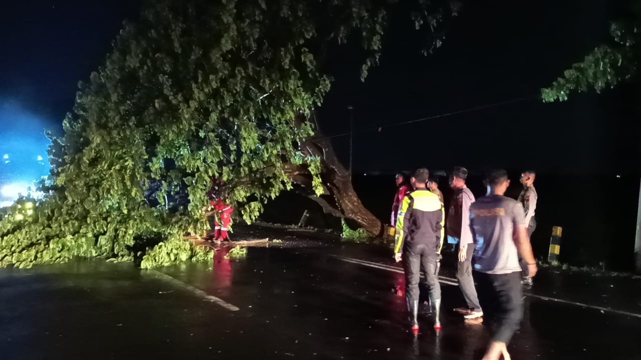 Petugas gabungan tampak sigap memotong batang pohon menggunakan gergaji mesin agar akses jalan segera bisa dilalui kembali. Personel Satlantas Polres Demak turut mengurai kemacetan dengan sistem contra flow di lokasi terdampak.