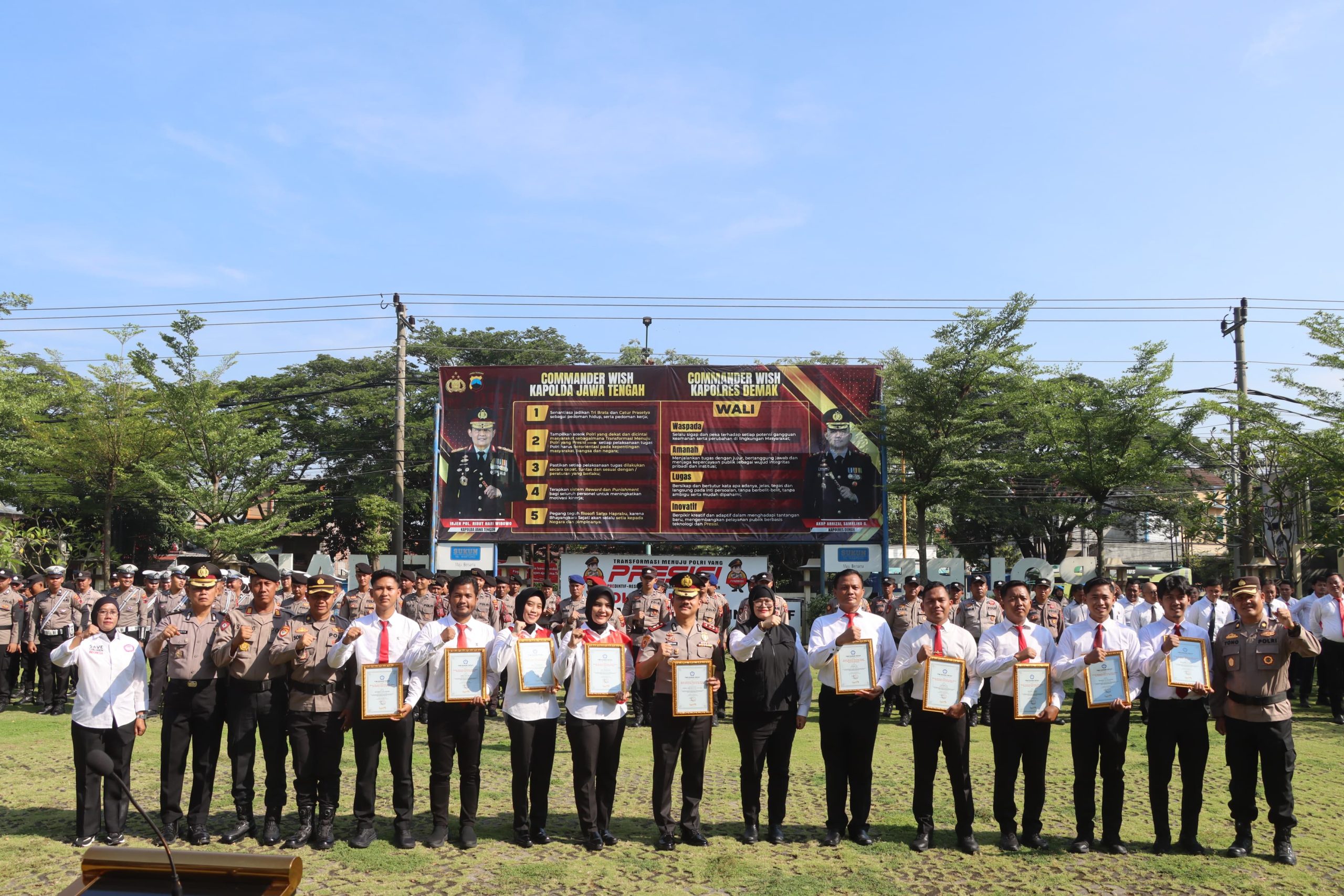 DEMAK NEWS FAKTA HUKUM DAN HAM CO lD – Kapolres Demak AKBP Arrizal Samelino Gandasaputra bersama Unit Perlindungan Perempuan dan Anak (PPA) Satreskrim Polres Demak menerima penghargaan dari Ketua Tim Reaksi Cepat Perlindungan Perempuan dan Anak (TRC PPA) Nasional. Penyerahan penghargaan dilaksanakan di Lapangan Apel Polres Demak, Senin (6/4/2026).