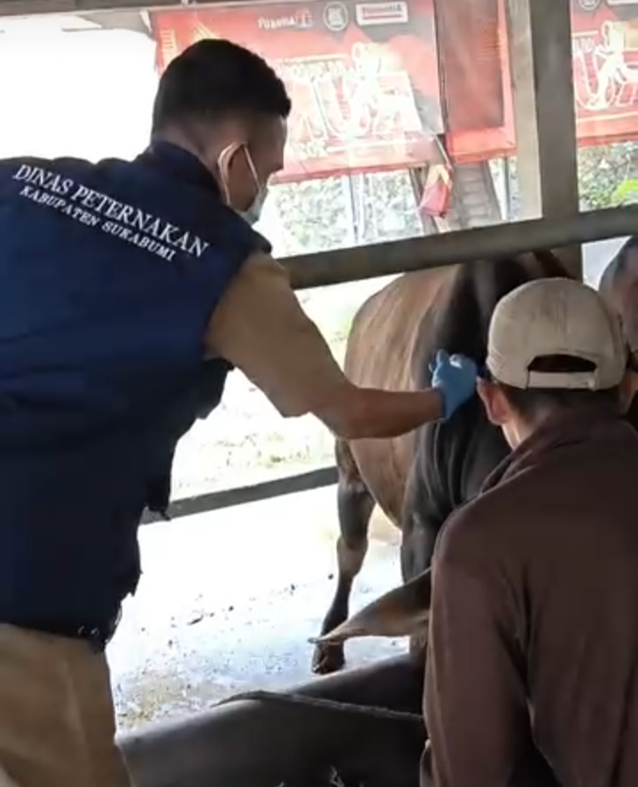 SUKABUMI — Tim Pusat Kesehatan Hewan (Puskeswan) Sukalarang melaksanakan kegiatan pelayanan kesehatan hewan (Pelkeswan) sekaligus vaksinasi Penyakit Mulut dan Kuku (PMK) pada ternak sapi potong dan kerbau milik peternak di Desa Kebonmanggu, Kecamatan Gunungguruh, Kabupaten Sukabumi.