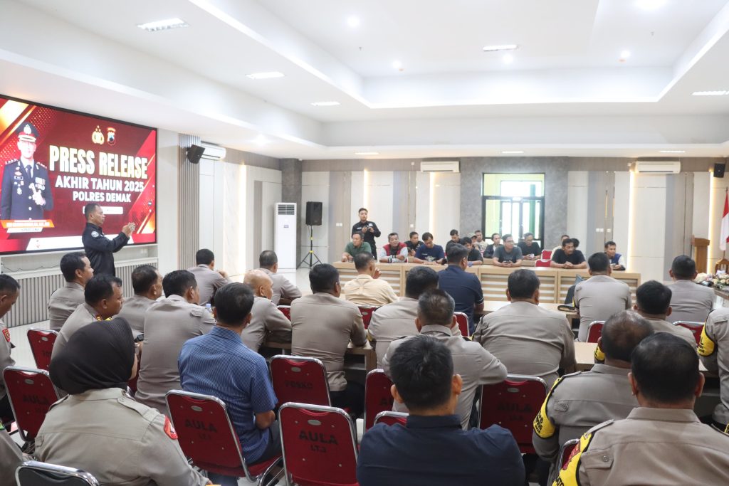 DEMAK NEWS FAKTA HUKUM DAN HAM CO lD—+Kepolisian Resor (Polres) Demak, Jawa Tengah, menggelar Rilis Akhir Tahun 2025 sebagai bentuk transparansi dan evaluasi kinerja kepolisian kepada publik. Kegiatan tersebut berlangsung di Aula Wicaksana Laghawa Polres Demak, Selasa (30/12/2025), dan dihadiri wartawan media cetak, online, maupun elektronik yang bertugas di Kabupaten Demak.
